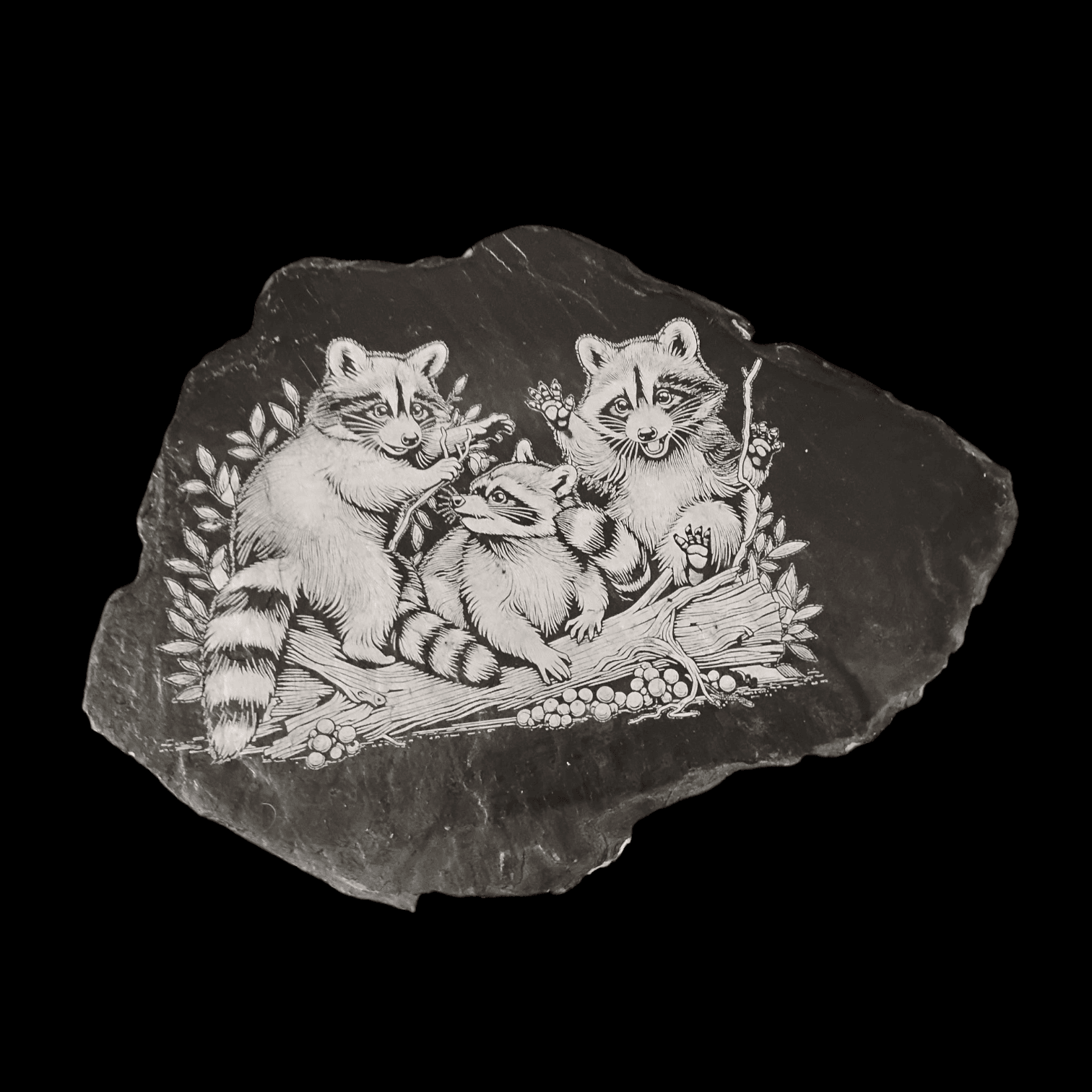 - Hand‑engraved raccoon family, detailed and expressive, bringing warmth and personality to natural slate